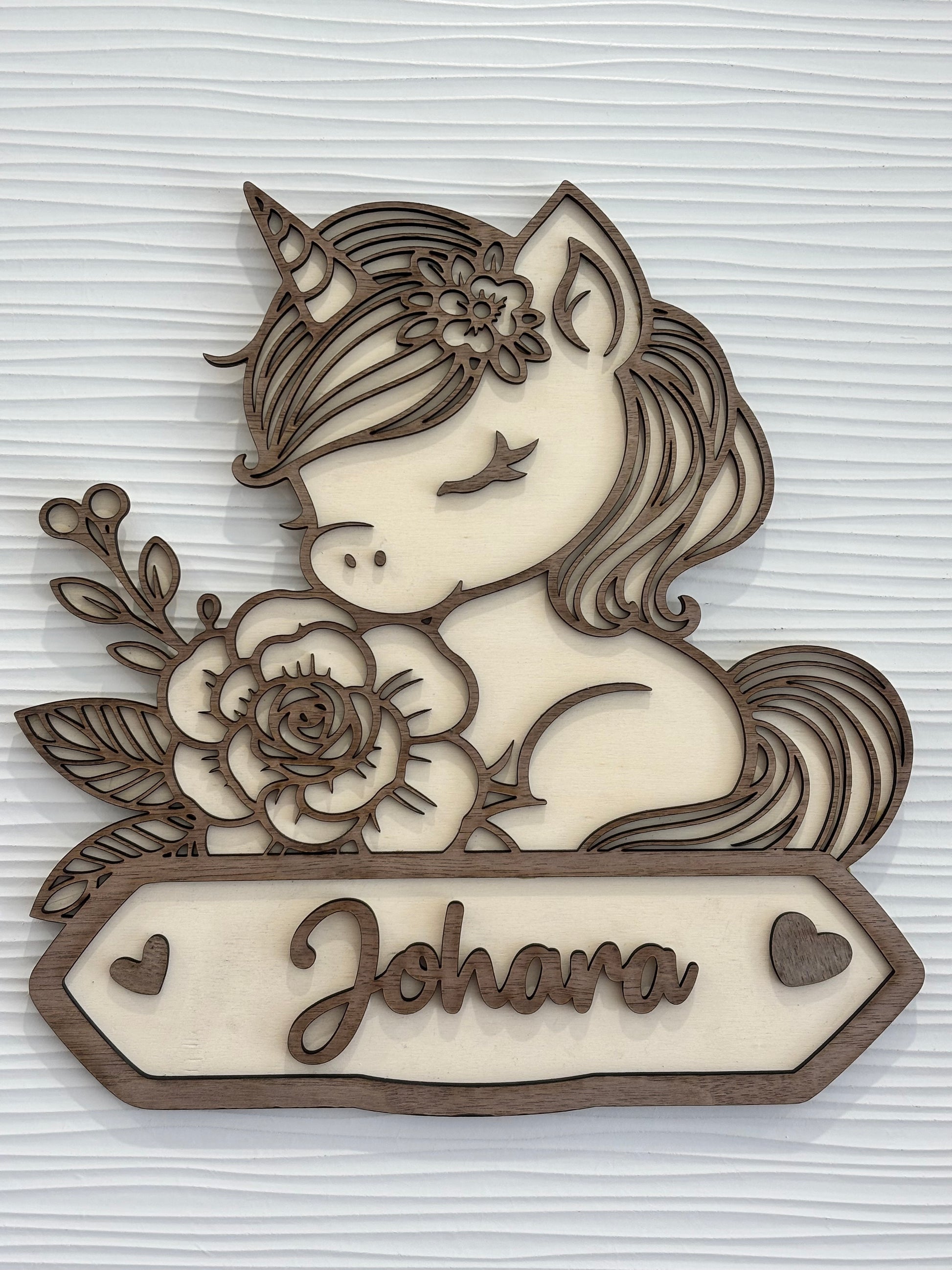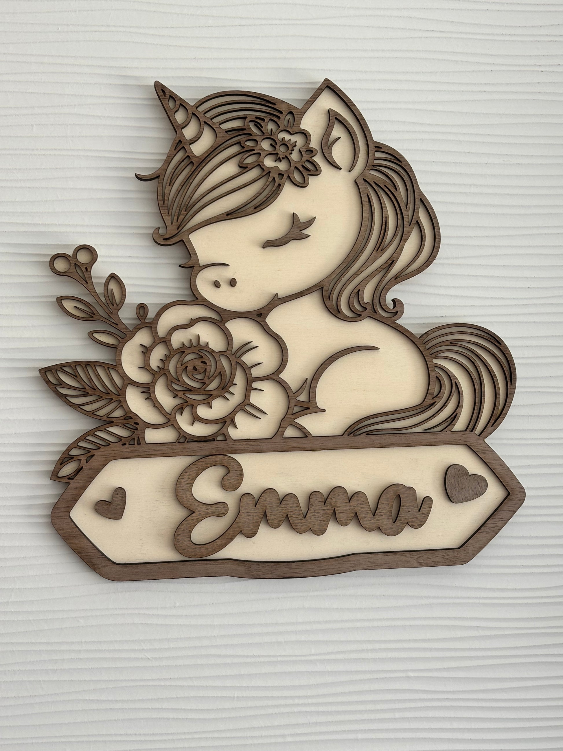 plaque de porte, plaque prénom, décoration chambre enfant, cadeau personnalisé, cadeau naissance, licorne, bois gravé, fait main, artisanal, cadeau fille, déco féérique, chambre bébé